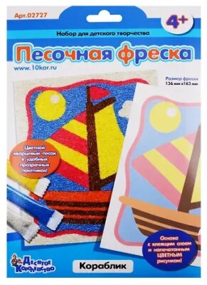 «Кораблик» — набор для детского творчества, который позволит Вашему ребенку от 4-х лет создать яркую и оригинальную картину. Интересная техника «засыпки» фрески цветным песком сделает творческий процесс увлекательным и веселым, научит малыша аккуратности и вниманию, способствует развитию мелкой моторики. Готовую картинку можно вставить в рамку. Цветная фреска может стать замечательным подарком для друзей и близких, сделанным своими руками.