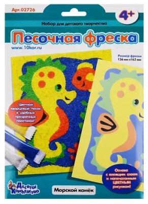 «Морской конек» — набор для детского творчества, который позволит Вашему ребенку от 4-х лет создать яркую и оригинальную картину. Интересная техника «засыпки» фрески цветным песком сделает творческий процесс увлекательным и веселым, научит малыша аккуратности и вниманию, способствует развитию мелкой моторики. Готовую картинку можно вставить в рамку. Цветная фреска может стать замечательным подарком для друзей и близких, сделанным своими руками.