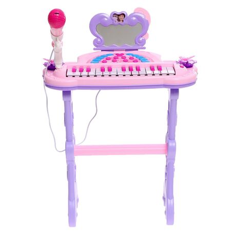 Пианино «Мечта девочки», со стульчиком, зеркалом, микрофоном. Пианино «Мечта девочки» привлечет внимание трогательным дизайном и надолго займет малышку благодаря множеству полезных функций. Игрушка не только развлечет ребенка — с ней можно осваивать новые навыки! <b> Особенности игрушки</b> <ul> <li> Ребенок услышит 25 встроенных мелодий или придумает свои.</li> <li> Есть различные звуки: 5 видов тембра, 5 музыкальных инструментов, 5 видов ударных инструментов.</li> <li> Игрушка воспроизводит 2 детские песенки на английском языке.</li> <li> Есть функция караоке, функции записи нет.</li> <li> Зеркало имеет световые эффекты. Размер зеркала: 9 × 14 × 1 см.</li> <li> Работает от 3 батареек типоразмера AA, батарейки в комплект не входят.</li> <li> Размер стульчика: 20 × 20 см.</li> <li> Рекомендовано детям старше 3 лет.</li> </ul> <b> Чем полезны занятия с музыкальной игрушкой</b> Взаимодействуя с игрушкой, ребенок тренирует мелкую моторику, координацию движений, развивает воображение, слуховое и визуальное восприятие.