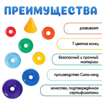 Пирамидка детская, развивающие задания, 7 колец, с конусом. Пирамидка — классическая развивающая игрушка, благодаря которой малыш потренирует важные навыки. В комплекте вы найдете карточки с заданиями, с которыми игры с пирамидкой станут еще увлекательнее и интереснее. <b> Особенности пирамидки</b> <ul> <li> Кольца 7 цветов.</li> <li> 32 карточки с разнообразными заданиями.</li> <li> Изготовлена из гипоаллергенного безопасного пластика, который не имеет запаха.</li> </ul> <b> Как играть</b> <ol> <li> Разрежьте брошюру по линиям реза на карточки.</li> <li> Дайте малышу пирамидку.</li> <li> Пусть ребенок выполняет задания с карточек.</li> </ol> <b> Чем полезна пирамидка</b> С такой пирамидкой ребенок прокачает логику, мелкую моторику и разовьет творческие способности. Малыш будет с интересом выполнять задания с карточек и придумывать собственные варианты сборки. Пирамидка рекомендована для детей от 1 года.