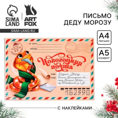 Письмо Деду Морозу, конверт А5, с наклейками «Новогодняя почта. Волшебное письмо». <b> Для заветных желаний</b> Как Дед Мороз узнает о том, какой подарок вы мечтаете получить? Конечно, с помощью новогоднего письма! Его яркий оригинальный дизайн привлечет внимание получателя и он, непременно, исполнит ваше желание в первую очередь! Настоящий ответ от Деда Мороза можно получить только в случае, если послание будет отправлено по всем требованиям волшебной почты (в конверте и с почтовыми марками) по адресам: <ol> <li> В России: 162340, Россия, Вологодская область, г. Великий Устюг, Деду Морозу (на русском языке). </li> <li> В Финляндии: Santa Claus, Joulupukin kamman, 96930 Napapuri, Rovaniemi, Finland (желательно на английском). </li> </ol> Письмо нужно отправлять заранее (в начале декабря), ведь у дедушки и его преданных помощников так много работы, что они могут просто не успеть ответить всем ребятишкам вовремя. Формат <b> конверта </b> — А5. Формат <b> письма </b> — А4.