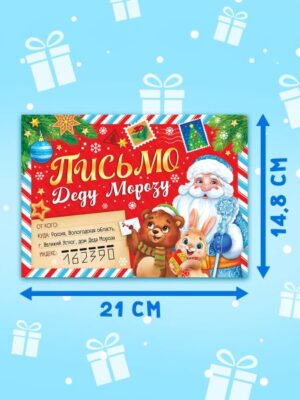 Письмо Деду Морозу, набор 10 шт.. Набор «Письмо Деду Морозу» — это волшебный способ создать праздничное настроение для детей. В комплекте 10 готовых писем формата А5, которые помогут малышам написать свои самые заветные желания и отправить их главному зимнему волшебнику. Новогодняя тематика и детский дизайн делают набор идеальным для подготовки к праздникам. <b> Особенности</b> <ul> <li> В наборе 10 писем, чтобы хватило на всех друзей или родных.</li> <li> Формат А5 удобен для детских ручек — писать легко и комфортно.</li> <li> Письма в виде конвертов с оборотней стороны добавляют реалистичности процессу отправки письма.</li> <li> Подходит для детей от 3 лет — простой и понятный дизайн.</li> <li> Новогодняя тематика создает атмосферу чуда и волшебства.</li> </ul> Написание письма Деду Морозу — это не просто игра, а важный этап развития. Ребенок учится формулировать свои мысли, мечтать и верить в чудеса. Процесс подготовки письма развивает фантазию, а также помогает малышу почувствовать себя частью праздника. С таким набором Новый год станет еще более запоминающимся!