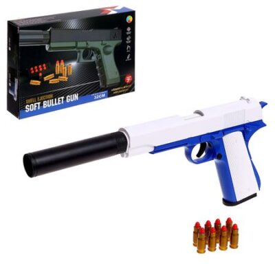 Пистолет «Кольт», с гильзами, глушителем, стреляет мягкими пулями. Оружие с мягкими пулями позволит устроить настоящую, но безопасную войнушку! Все патроны обладают хорошей скоростью и точностью удара, но при этом не способны навредить ребенку. <b> Особенности детского пистолета</b> <ul> <li> Полностью выполнен из качественного и безопасного пластика.</li> <li> Длина с глушителем — 34 см.</li> <li> Поролоновые пули с наконечником вставляются в пластиковые гильзы.</li> <li> Диаметр пуль — 0,7 см. Гильзы — 0,8 см.</li> <li> Глушитель снимается.</li> <li> Дальность выстрела — до 15 метров.</li> <li> Подходит для детей от 7 лет и старше.</li> <li> Для работы не требуются батарейки.</li> </ul> <b> Как стрелять</b> <ol> <li> Вставьте пулю в гильзу и зарядите магазин.</li> <li> После выстрела при перезарядке пустая гильза вылетает как у настоящего оружия.</li> </ol> <b> Комплектация</b> <ul> <li> Глушитель.</li> <li> Магазин.</li> <li> Пистолет.</li> <li> 10 пуль размером 1,5 × 0,7 см.</li> <li> 8 гильз размером 2,5 × 1 см.</li> </ul> <b> Увлекательно и полезно!</b> Игра с детским оружием поможет стимулировать фантазию и воображение ребенка, а также улучшить координацию движений и мелкую моторику.