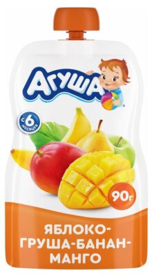Детское фруктовое пюре Агуша в мягкой упаковке. Возьмите на прогулку вкусный перекус от Агуша! Насыщенный вкус яблока, груши, банана, манго. Готово к употреблению. Удобно взять с собой на прогулку.