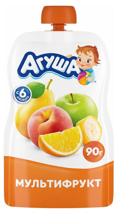 Детям с 6 месяцев. Пюре Агуша Мультифрукт с 6 мес 90 гр (пауч)Пастеризованный продукт в удобной мягкой упаковке. Теперь пюре можно брать с собой на прогулку или на отдых, чтобы перекусить в любой момент. Малышу надо всего лишь надавливать на пакетик и кушать пюре самостоятельно, не проливая на себя ни капельки. Яблоко — источник фруктовых кислот, железа, витамина С. Пектины и фруктовые кислоты в яблоке мягко стимулируют деятельность кишечника. Сочетание витамина С и железа — прекрасная профилактика анемии. Мякоть сочной зрелой груши богата органическими кислотами, повышающими выделение пищеварительных соков и активность ферментов. Это улучшает аппетит ребенка. В плодах груши много калия, который оказывает благотворное влияние на работу сердечно-сосудистой системы. Пюре из груши содержит растительную клетчатку и пектин, которые имеют бактерицидные свойства и способствуют росту собственных бифидобактерий в кишечнике. В бананах содержится большое количество витаминов Е, С, В6 и калия. Персик — источник калия, богат витаминами и минеральными солями, пектином. Органические кислоты и клетчатка персика благоприятно воздействуют на работу кишечника. Апельсиновый сок источник витамина С, А, Е, К, витаминов группы В и пектина. Апельсиновый сок обладает сильными антиоксидантными свойствами, очищает кровь от холестерина, укрепляет стенки сосудов. Без сахараикрахмала. Без консервантов, красителей, ароматизаторов и ГМО. Инструкция по употреблению:рекомендуется начинать с 0,5 чайной ложки, увеличивая к 12 месяцам до 100 грамм в день.