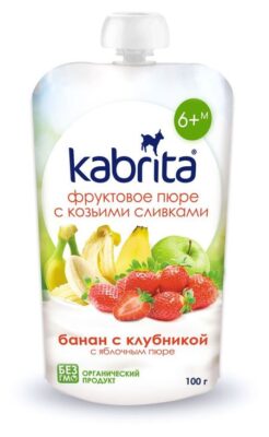 Пюре Kabrita — спелые яблоки, бананы и сладкая клубника в сочетании с нежными сливками козьего молока. Удобно брать с собой. Идеальное решение для полдника, второго завтрака, перекуса, прогулок и путешествий как для малышей, так и для детей более старшего возраста. Удобная и современная мягкая упаковка способствует развитию мелкой моторики малыша и навыков самостоятельности. Не требует хранения в холодильнике.