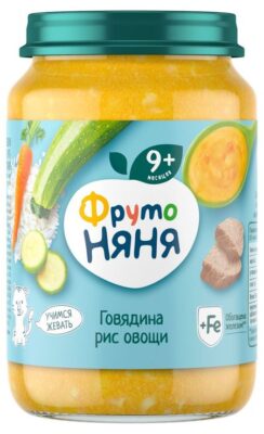 Пюре с кусочками из говядины, риса и овощей ФрутоНяня это полноценный прием пищи в обед или на ужин для ребенка в возрасте от 9 месяцев. Мясорастительное пюре поможет разнообразить рацион малыша сочетанием любимых овощей и мяса. Небольшие кусочки в составе способствуют развитию жевательного навыка ребенка. Состав из натурального сырья (морковь, кабачок, говядина, рис, лук репчатый) дополнительно обогащен железом для нормального роста и развития вашего малыша.