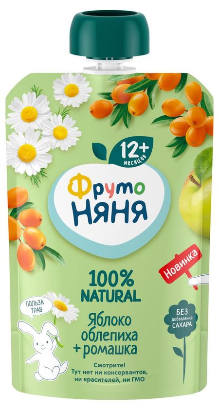Фруктовое пюре в мягкой упаковке ФрутоНяня Яблоко, облепиха, ромашка это вкусный и полезный перекус, который удобно брать с собой, а яркая мягкая упаковка привлечёт внимание вашего малыша и позволит ему есть самостоятельно. Алтайская облепиха, спелые яблоки и натуральный экстракт ромашки обеспечат вашего малыша природной пользой и энергией для гармоничного роста!