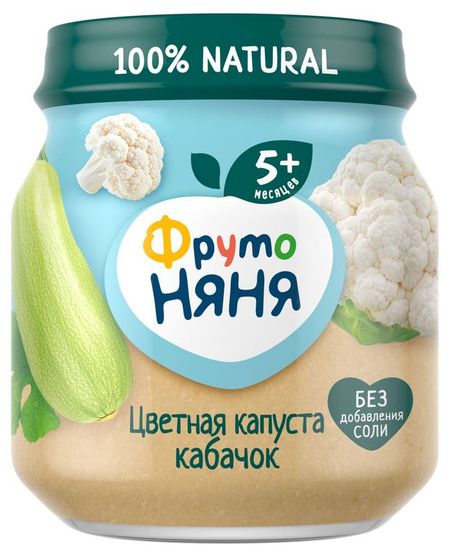 Пюре из цветной капусты и кабачков ФрутоНяня в увеличенном формате 110 г. Вы с легкостью расширите рацион малыша начиная уже с 5 месяцев. В составе нежного пюре только отборные овощи, а также чистая питьевая вода. Чтобы сохранить натуральный вкус и все полезные свойства, которые содержатся в овощах, мы не добавляем в пюре красители, консерванты и даже соль.