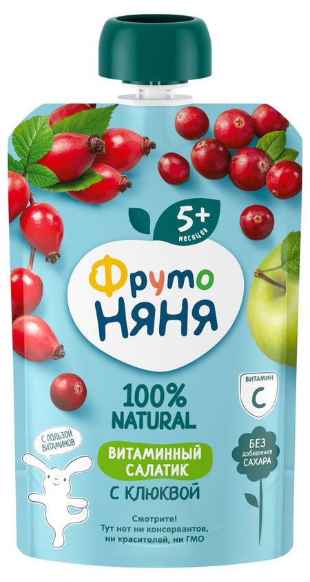 Фруктовое пюре Витаминный салатик от ФрутоНяни в мягкой упаковке это вкусный и полезный перекус, который удобно брать с собой, а яркая мягкая упаковка привлечет внимание вашего малыша и позволит ему есть самостоятельно. Спелые яблоки, ягоды клюквы, шиповника и витамин С обеспечат организм вашего малыша природной пользой и энергией для гармоничного роста!