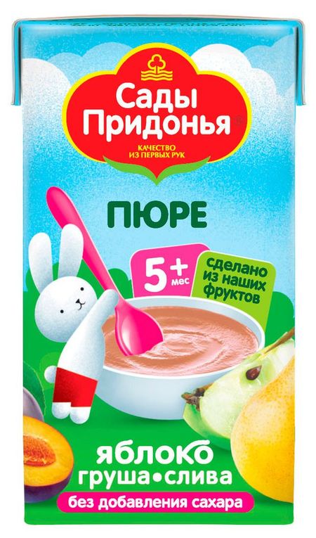 Детям с 5 месяцев. Пюре Сады Придонья Яблоко-Груша-Слива с 5 мес 125 гр. Пюре яблоко-груша-слива — отличное сочетание трех полезных фруктов в одной пачке. Смешанное пюре богато фруктовыми сахарами, пищевыми волокнами, а также калием и кальцием. Яблоки и сливы являются богатым источником витаминов и минеральных веществ, груша отличается низкой калорийностью и содержит органические кислоты, клетчатку, каротин. Рекомендуется для профилактики запоров у детей. 100% качество. Без сахара. Без крахмала. Без консервантов, красителей и ГМО. Способ употребления: рекомендуется начинать с 0,5 чайной ложки, увеличивая к 12 месяцам до 100 грамм в день. Продукт готов к употреблению. Перед употреблением перемешать.