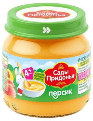 Персиковое пюре содержит органические кислоты, витамины группы В, минеральные вещества, — каротин и пектиновые вещества. Пюре из спелых персиков имеет приятный нежный вкус. Наличие пищевых волокон способствует профилактике запоров у маленького ребёнка.