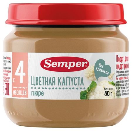 Цветная капуста обладает хорошими вкусовыми качествами и имеет по сравнению со многими другими овощами значительную пищевую ценность. Цветная капуста содержит нежную растительную клетчатку, богата аскорбиновой кислотой и витаминами А, группы В, РР, белком, углеводами, минеральными солями фосфора, кальция и магния. В ее головках содержатся полноценные по аминокислотному составу белки. В цветной капусте также присутствуют железо и кобальт, магний и йод все это необходимо для нормальных обменных процессов, что очень важно для быстро растущих маленьких детей. По набору и содержанию витаминов (витамин С, группы В, Е, РР) цветная капуста находится в числе лидеров среди овощей. Она допускает мягкую термическую обработку и особенно полезна в детском питании. Поэтому наше пюре из цветной капусты получилось очень нежным, однородным и вкусным. Трудно найти лучшее блюдо, решая, с чего начинать прикорм, если только Вы не выберете цветную капусту от Semper.