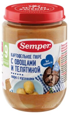Детям с 9 месяцев. Пюре Semper Картофельное пюре с овощами и телятиной с 9 мес 190 гр. Знакомство с мясными блюдами продолжит нежная телятина. Овощной гарнир этого блюда составляют молодой картофель и молодая морковь. Смесь ценных растительных масел обогащает это блюдо полиненасыщенными жирными кислотами. Петрушка и белый перец оттеняют вкусовые преимущества этого блюда. Все как у взрослых, но только для детей! Сбалансированное мясо-овощное блюдо. С кусочками для развития навыков жевания. Без крахмала. Способ употребления: готово к употреблению. Нужное количество подогреть, перед употреблением перемешать. Вводить начиная с 0,5 чайной ложки 1 раз в день, постепенно увеличивая объем в соответствии с возрастом. Открытую упакову в холодильнике с закрытой крышкой не более 24 часов. Беречь от солнечных лучей. картофель, морковь, мясо телятины, рапсовое масло, рисовая мука, петрушка, белый перец, вода. Пищевая ценность (средние значения на 100 г):белки 2,7 г, углеводы 8 г, жиры 2,8 г, энергетическая ценность 70 ккал / 293 кДж. Срок годности: 24 месяца. В коробке 12 штук. Для принятия решения о сроках и способе введения данного продукта в рацион ребенка необходима консультация специалист Возрастные ограничения указаны на упаковке товаров в соответствии с законодательством РФ.