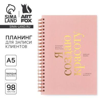 Планер для записи клиентов А5, 98 листов, на гребне «Я создаю красоту». Этот планинг поможет тебе в организации дел и планировании важных приобретений. Ты сможешь подвести итоги и повысить свою эффективность. <ul> <li> Формат: А5</li> <li> Тип скрепления: на гребне/спирали;</li> <li> Количество листов: 98;</li> <li> Плотность, г/м²: 80;</li> <li> Вид обложки: твердая.</li> </ul>