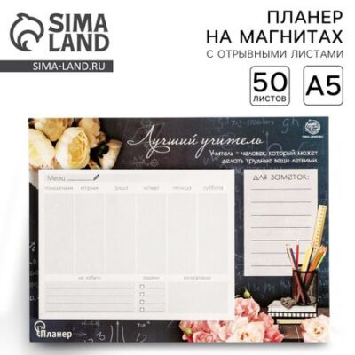 Планер на магнитах с отрывными листами «Лучший учитель», 50 л., 15×20 см, размер части для заполнения 10×13 см. Планер на магнитах с отрывными листами отлично подойдет в качестве подарка. Яркий дизайн несомненно привлечет внимание и будет выделяться , а удобный формат позволит использовать с комфортом. • Пиши • Планируй • Выполняй <ul> <li> Размер блока: 10 х 13 см;</li> <li> Размер подложки: 15 х 20 см;</li> <li> Количество листов: 50;</li> <li> Крепление : отрывной;</li> <li> Особенности : дизайнерский блок;</li> <li> Упаковка: пленка.</li> </ul> Состав: Бумага, картон, магнит.