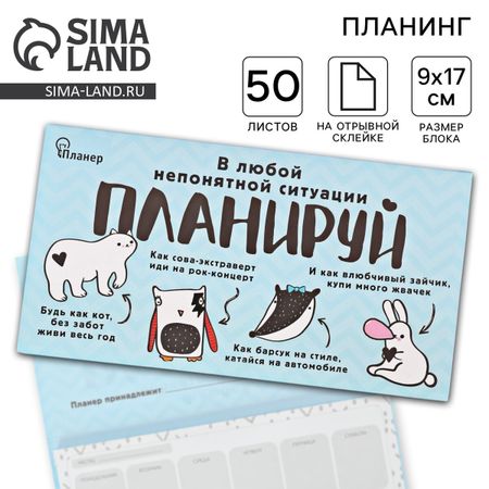 Планер с отрывными листами «В любой непонятной ситуации планируй». Организуйте свой день с комфортом! Планер станет вашим надежным ассистентом в решении повседневных задач как дома, так и в офисе, а блок с отрывными листами даст возможность всегда иметь важные заметки под рукой и легко систематизировать информацию. Отлично подойдет для: <ul> <li> Планирования задач</li> <li> Ведения заметок</li> <li> Создания списков</li> <li> Организации дел</li> </ul> Создайте свой идеальный день вместе с нашим планером