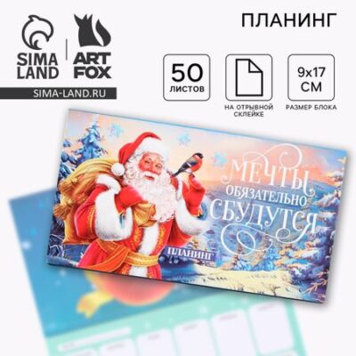 Планер с отрывными листами, 50 листов «Новый год: Мечты обязательно сбудутся». Планинг мини станет прекрасным подарком на праздник. • Мечтай; • Записывай; • Выполняй. <ul> <li> Размер, см:17,5 х 9,5 ;</li> <li> Форма: прямоугольник ;</li> <li> Количество листов: 50 ;</li> <li> Тип скрепления: на отрывной склейке ;</li> <li> Упаковка: пакет.</li> </ul> Состав: бумага, картон.