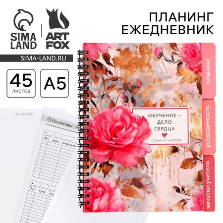 Планинг-ежедневник на спирали с разделителями для учителя «Обучение — дело сердца», А5, 45 листов. Планинг-ежедневник отлично подойдет в качестве подарка. Яркий дизайн несомненно привлечет внимание и будет выделяться , а удобный формат позволит использовать с комфортом. • Пиши • Планируй • Выполняй <ul> <li> Обложка : мягкая;</li> <li> Количество листов: 45;</li> <li> Крепление : На гребне/спирали;</li> <li> Особенности : дизайнерский блок;</li> <li> Формат: А5;</li> <li> Упаковка: пленка.</li> </ul> Состав: бумага, картон. Дополнительно: <ul> <li> Планинг 15 л.;</li> <li> Успеваемость 20 л.;</li> <li> Заметки 10 л.</li> </ul>