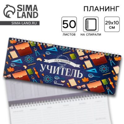 Планинг прямоугольный тонкий картон «Лучший учитель», 50 листов. Планинг прямоугольный отлично подойдет в качестве подарка. Яркий дизайн несомненно привлечет внимание и будет выделяться , а удобный формат позволит использовать с комфортом. • Пиши • Планируй • Выполняй <ul> <li> Обложка : мягкая;</li> <li> Количество листов: 50;</li> <li> Крепление : на гребне/спирали;</li> <li> Особенности : дизайнерский блок;</li> <li> Упаковка: пленка.</li> </ul> Состав: Бумага, картон.