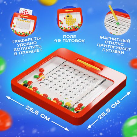 Планшет-мозаика магнитный для рисования «Пуговки», 49 ячеек. Игра «Магнитное рисование» поможет обучить ребенка письму в дошкольном возрасте. В комплект входит планшет с разноцветными пуговками и ручка-магнит. Перемещать элементы легко – они сами слушаются палочку с намагниченным наконечником и перелетают в круглые прозрачные ячейки. Малышу не нужно прикасаться к ним руками – чтобы пуговка следовала за стилусом проведите им по понели перемещая в одно из отверстий. Пока ребенок совсем маленький, можно использовать обучающие карточки (входят в комплект) и повторять рисунки на них. Когда он подрастет, — придумывать сюжеты самому. Большое поле позволяет рисовать все, что придет в голову.