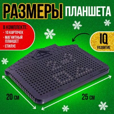 Планшет обучающий «Магнитное рисование», новогодний, цвет черный, 375 отверстий. Обучающий планшет с магнитными шариками — это интересная и полезная игрушка для детей, которая превращает процесс рисования в увлекательное занятие. Ребенок легко создает изображения, буквенные и цифровые символы, используя магнитный стилус. Благодаря удобному формату планшет подходит для занятий дома и в дороге. <b> Что делает планшет полезным?</b> <ul> <li> Помогает развивать воображение и креативное мышление.</li> <li> Тренирует мелкую моторику, что особенно важно на этапе подготовки к письму.</li> <li> Позволяет осваивать буквы, цифры и геометрические фигуры в игровой форме.</li> <li> Легко стирается — достаточно провести пальцем или специальным инструментом.</li> <li> Не требует бумаги и красок, что делает процесс безопасным и чистым.</li> <li> Компактный и легкий, его удобно брать в поездки.</li> </ul> <b> Как играть?</b> Стилусом нужно проводить по поверхности планшета, поднимая магнитные шарики вверх и создавая рисунок. Если хочется изменить изображение, достаточно провести рукой по полю или использовать боковую сторону стилуса, чтобы вернуть планшет в исходное состояние. <b> Кому подойдет?</b> Планшет станет отличным выбором для детей, которые только начинают осваивать письмо и рисование. Игрушка подойдет как для самостоятельных занятий, так и для совместных игр с родителями.