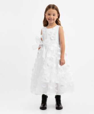 Для самых милых и нежных снежинок — белое приталенное платье без рукавов, выполненное из двух слоёв — основного материала и белой пышной сетки с круглыми нашивками. Нижний слой изготовлен из дышащего хлопкового текстиля, что позволяет носить изделие на протяжении всего дня и не чувствовать дискомфорта. Платье дополнено поясом, с помощью которого можно создать красивый акцент на талии. Платье застёгивается на молнию.