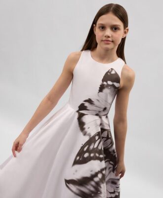 Белое приталенное платье без рукавов, с модной неровной линией низа подойдет для любых летних торжеств. Выполненное из матового текстиля, платье смотрится очень нарядно, стильно, элегантно. Черно-белый принт, расположенный асимметрично, наделяет модель острой современной графикой, придаёт платью выразительность и уникальность. Хлопковая подкладка создает комфортное прилегание к телу.Платье застёгивается на молнию.