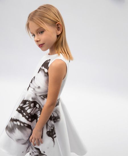 Белое приталенное платье без рукавов, с модной неровной линией низа подойдет для любых летних торжеств. Выполненное из матового текстиля, платье смотрится очень нарядно, стильно, элегантно. Черно-белый принт, расположенный асимметрично, наделяет модель острой современной графикой, придаёт платью выразительность и уникальность. Хлопковая подкладка создает комфортное прилегание к телу.Платье застёгивается на молнию.