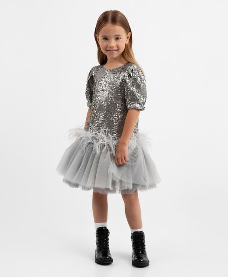 Именно так выглядело бы маленькое серое платье! Лёгкое, воздушное и невероятно стильное, оно построено на сочетании трёх фактур: сетки, расшитой серебристыми пайетками, мягкого дышащего трикотажа в качестве подкладки и пышной сетки на юбке. Комбинация пайеток разного размера формирует рисунок в горох, делает платье очень элегантным и утонченным. Объёмная юбка из сетки, дополненная страусиными перьями, формирует трапециевидный силуэт. Платье имеет короткие рукава-фонарики.Платье застёгивается на молнию на спинке.