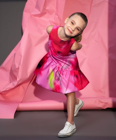 Нарядное платье, выполненное из плотного шелковистого текстиля с преимущественным содержанием вискозы, выглядит стильно, интересно, свежо. Трапециевидная форма модели, усиленная широким двойным асимметричным воланом, формирует нежный женственный силуэт ребенка. Насыщенный цвет и абстрактный рисунок, отражающий один из трендов летнего сезона — глитч эффект (glitch: смещение, нечеткость, смазанность изображения), делают платье ярким, необычным, запоминающимся. В оформлении модели использован мелкий шрифтовой принт, подчеркивающий оригинальный дизайн на стыке романтики и спорта. Платье застегивается на потайную молнию на спинке. Тонкая хлопковая подкладка создает приятный тактильный контакт с кожей девочки.