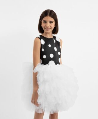 Воздушное платье в горох, которое способно завоевать сердце девочки с первых секунд! Верх изделия, выполненный из блестящего, гладкого и плотного сатина, выглядит безупречно. Белая юбка из сетки смотрится очень фактурно и нежно. Она, словно белое облако, мягко окутывает девочку, делая её походку изящной, лёгкой, грациозной. Хлопковая подкладка придаёт юбке форму и позволяет двигаться комфортно и свободно.Платье на молнии, дополнено поясом.