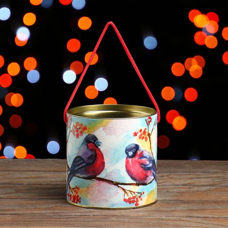 Подарочная коробка, тубус «Снегири с рябиной» 120×120 мм (100 мм внутр. высота).. Подарочная туба выполнена из плотного картона и металла. Изделие оформлено красочным изображением. Туба оснащена крышкой. В комплект входит подвесное декоративное украшение. Подарочная туба — это оригинальное решение, если вы хотите порадовать близких людей и создать праздничное настроение, ведь подарок, преподнесенный в необычной упаковке, всегда будет самым эффектным и запоминающимся. Окружите близких людей вниманием и заботой, вручив презент в нарядном, праздничном оформлении.