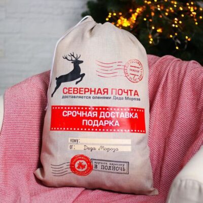 Подарочный мешок Деда Мороза «Северная почта» холщовый, 40 х 60 см.. Новогодний мешок Деда Мороза «Северная почта» поможет дополнить образ Деда Мороза в новогоднюю ночь! На мешке можно написать имя того ребенка, кому предназначается подарок внутри. Также его можно использовать в качестве упаковки для подарка, малыш удивится, когда найдет под елкой подарок в таком мешке! <b> Особенности</b> <ul> <li> Размер мешка: 60 × 40 см.</li> <li> Мешок выдерживает до 1,5 кг.</li> <li> Новогодний мешок сделан из холщовой ткани.</li> <li> Мешок можно использовать для создания праздничного интерьера, он обязательно поднимет новогоднее настроение!</li> </ul>