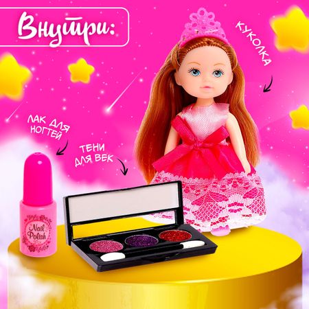 Подарочный набор «Сияй ярче звезд», кукла, косметика. Ваша принцесса любит играть и модничать? Тогда от этого набора она будет в восторге, ведь в нем есть куколка и детская косметика! Набор упакован в красочную коробочку, поэтому его можно вручить в подарок даже без дополнительной праздничной упаковки. <b> Что в наборе</b> <ul> <li> Куколка высотой 10 см. Игрушка очень компактная, поэтому ее удобно захватить с собой на прогулку, в гости и даже в путешествие!</li> <li> Косметика: тени для век, лак для ногтей. Все легко смывается водой, содержит минимум пигмента и бережет нежную детскую кожу!</li> <li> Также в комплекте есть переводная татуировка.</li> <li> С помощью косметики и татуировки из набора девочка сможет создать яркий образ для себя и куколки!</li> <li> Подходит для детей в возрасте от 3 лет.</li> </ul> <b> Чем полезен набор</b> Взаимодействуя с такими игрушками, девочка улучшает сообразительность, тренирует фантазию и эстетический вкус, а также мелкую моторику.