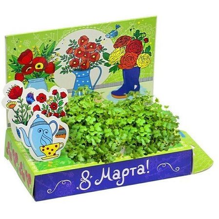 Живая открытка «С 8 марта» Happy Plant – оригинальный и милый подарок. Внутри красочной коробочки вы найдете настоящий живой мини-садик. Откройте подарочную коробочку, достаньте инструкцию и посадите по ней семена в специальную ткань. Первый всходы появятся уже через несколько дней. Поставьте ваш садик в светлое место и смотрите как красиво он растет.Живая открытка – это подарок, который запомнится надолго. В наборе есть все необходимое, чтобы вырастить настоящий зеленый садик: поддон для выращивания, специальная агроткань, семена базилика, фигурки для украшения.В комплекте: коробочка с поддоном для выращивания, семена в герметичной колбе, специальный материал для проращивания, декор, инструкцияРазмер упаковки: 15х8х2.5 смСтрана производства: Россия
