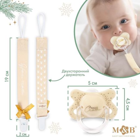 Подарочный набор новогодний M&B «Наше счастье»: соска-пустышка ортодонт., от 6 мес., и держатель на ленте, подарочная упаковка. Соска-пустышка со скошенным латексным соском предназначена для детей с 6 мес. Форма нагубника с симметрично расположенными отверстиями обеспечивает свободную циркуляцию воздуха для предотвражения появления опрелостей. Указанный возраст является рекомендованным и зависит от индивидуальных особенностей развития ребенка. кольцо для клипсы-держателя отверстия в нагубнике для циркуляции воздуха скошенный сосок не содержит бисфенол-А (BPA free) Материалы: полипропилен (PP), силикон Возраст: от 6 месяцев Срок службы: 30 дней. Прищепка для пустышки предотвратит потерю маленького предмета. Используйте специальный держатель, и соска всегда будет под рукой! Изделие фиксируется на одежде ребенка. На конце цепочки есть карабин, который зацепляется за кольцо пустышки. Надежное крепление убережет вещь от падения на пол, если малютка случайно выронит ее изо рта. С держателем можно играть, притягательный дизайн точно понравится малышу. Товар изготовлен из качественного нетоксичного материала. Подходит для деток с рождения. Прищепка-держатель станет прекрасным подарком для малышей и родителей!
