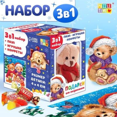 Набор пазлов «Подарки от медвежат» — то, что нужно для полезного и интересного досуга! Такой подарок поможет ребёнку скрасить ожидание Нового года, а также потренировать мелкую моторику, внимательность, логическое мышление и память.В наборе вы найдёте 2 пазла, мягкую игрушку и сладкие угощения.Польза собирания пазлов для детей:развивает логическое мышление и кратковременную память;тренирует усидчивость и мелкую моторику рук;учит различать цвета и находить связь между частью и целым.Особенности набораРебёнок соберёт 2 квадратных пазла с новогодним сюжетом.Размер собранных картинок: 24 × 24 см.Детали большого размера удобно держать маленькими ручками.Размеры деталей: 4 × 4 см.Размер игрушки: 12 × 8 см.Размер коробки: 12,5 × 12,5 см.Изделие выполнено из приятного на ощупь материала.Верх сшит из мягкого полиэстера.Наполнитель — синтепон.Глазки выполнены из пластика.Как ухаживать за мягкой игрушкойЕсли изделие испачкается, его можно постирать в тёплой воде или протереть влажной губкой.Рекомендуем стирать в воде при температуре 30–40 °C в режимах «Деликатная стирка», «Ручная стирка», «Шерсть».После водных процедур игрушку необходимо хорошо просушить, чтобы избежать неприятного запаха затхлости.Не рекомендуем сушить изделие на батарее: от высокой температуры и длительного контакта с горячей поверхностью материал игрушки может испортиться.Если у изделия присутствует мех, после полного высыхания его необходимо расчесать.Набор рекомендован детям старше 3 лет.