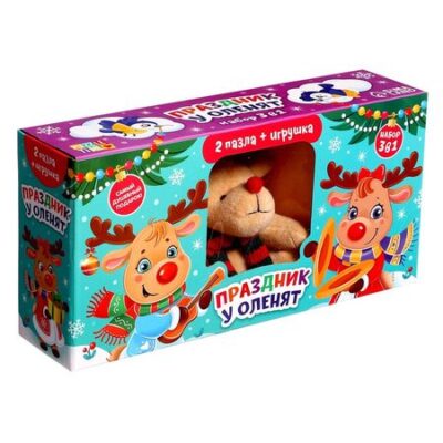 Набор пазлов «Праздник у оленят» — то, что нужно для полезного и интересного досуга! Такой подарок поможет ребёнку скрасить ожидание Нового года, а также потренировать мелкую моторику, внимательность, логическое мышление и память.Польза собирания пазлов для детей:развивает логическое мышление и кратковременную память;тренирует усидчивость и мелкую моторику рук;учит различать цвета и находить связь между частью и целым.Особенности набораРебёнок соберёт 2 пазла с разным количеством деталей.Размер собранных картинок: 28 × 20 см.Размеры деталей: 5 × 4 см и 4 × 3,5 см.Размер игрушки: 10 × 6 см.Изделие выполнено из приятного на ощупь материала.Верх сшит из мягкого полиэстера.Наполнитель — синтепон.Глазки выполнены из пластика.Как ухаживать за мягкой игрушкойЕсли изделие испачкается, его можно постирать в тёплой воде или протереть влажной губкой.Рекомендуем стирать в воде при температуре 30–40 °C в режимах «Деликатная стирка», «Ручная стирка», «Шерсть».После водных процедур игрушку необходимо хорошо просушить, чтобы избежать неприятного запаха затхлости.Не рекомендуем сушить изделие на батарее: от высокой температуры и длительного контакта с горячей поверхностью материал игрушки может испортиться.Если у изделия присутствует мех, после полного высыхания его необходимо расчесать.Набор рекомендован детям старше 3 лет.
