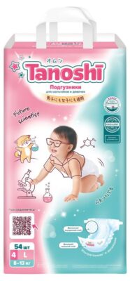 Tanoshi (с японского восхитительный) созданы экспертами отрасли с многолетним опытом и сочетают в себе все самые лучшие разработки последних лет в изготовлении детских подгузников. С Tanoshi безопасно: