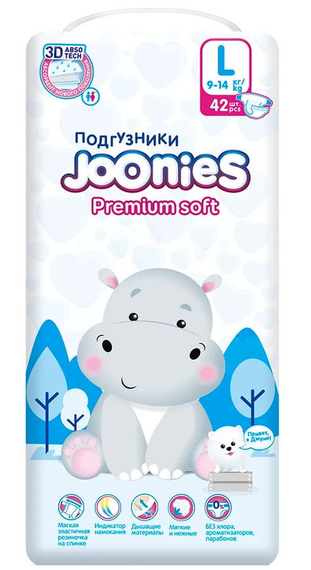 Joonies Premium Soft теперь в новом дизайнеПодгузники Joonies Premium Soft — это ультратонкие подгузники последнего поколения.Внешняя поверхность трусиков напоминает КАШЕМИР, они очень приятны телу и не заметны под одеждой.Равномерное впитывание по всей поверхности внутреннего слоя позволяет малышу чувствовать себя комфортно в трусиках до 12 часов3D рельеф внутренней поверхности уменьшает площадь касания подгузника с кожей ребенка, тем самым улучшает воздухообмен и помогает избежать раздражения и опрелостей.Благодаря двухслойному материалу, поверхность всегда остается сухой.Впитывающий слой трусиков состоит из премиального современного абсорбента, воздушной целлюлозы и воздушного нетканого материала, благодаря чему абсорбирующий слой не раздуется и не скомкается.При надевании подгузника, не забывайте поправлять внутренние резиночки-бортики, которые блокируют боковые протекания. У каждого размера теперь свой милейший дизайн трусиков.Joonies Premium Soft — милые подгузники, для самых милых малышейХарактеристики: Тип подгузников и трусиков: подгузникиРазмер подгузников и трусиков: L (9-14 кг)Размер упаковки: средняяКол-во в упаковке, шт.: 42Длина упаковки, см: 15Ширина упаковки, см: 42Высота упаковки, см: 26Вес упаковки, кг: 1.33
