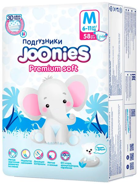 Joonies Premium Soft теперь в новом дизайнеПодгузники Joonies Premium Soft — это ультратонкие подгузники последнего поколения.Внешняя поверхность трусиков напоминает КАШЕМИР, они очень приятны телу и не заметны под одеждой.Равномерное впитывание по всей поверхности внутреннего слоя позволяет малышу чувствовать себя комфортно в трусиках до 12 часов3D рельеф внутренней поверхности уменьшает площадь касания подгузника с кожей ребенка, тем самым улучшает воздухообмен и помогает избежать раздражения и опрелостей.Благодаря двухслойному материалу, поверхность всегда остается сухой.Впитывающий слой трусиков состоит из премиального современного абсорбента, воздушной целлюлозы и воздушного нетканого материала, благодаря чему абсорбирующий слой не раздуется и не скомкается.При надевании подгузника, не забывайте поправлять внутренние резиночки-бортики, которые блокируют боковые протекания. У каждого размера теперь свой милейший дизайн трусиков.Joonies Premium Soft — милые подгузники, для самых милых малышейХарактеристики: Тип подгузников и трусиков: подгузникиРазмер подгузников и трусиков: M (6-11 кг)Размер упаковки: большаяКол-во в упаковке, шт.: 58Длина упаковки, см: 11Ширина упаковки, см: 26Высота упаковки, см: 37Вес упаковки, кг: 1.66