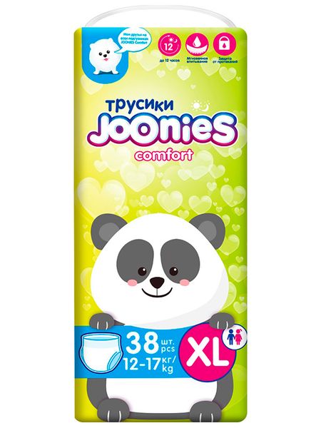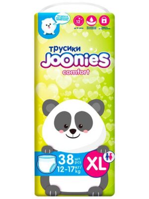 Подгузники-трусики Joonies Comfort размер XL 12-17кг, 38шт — детские подгузники-трусики Joonies Comfort полюбили тысячи родителей. Милые мордочки зверят изображены не только на пачке, но и на самих трусиках. Трусики тонкие и приятные к телу, а их внутренняя рифленая поверхность защищает кожу от раздражений. Впитывающий слой состоит из двухслойного суперабсорбента, который надежно удерживает влагу внутри подгузника.Широкая резиночка и оборочки вокруг ножек плотно прилегают к телу малыша и защищают от протеканий. Полоски-индикаторы сменят цвет и подскажут, когда пора обновить подгузник. Липкая лента поможет закрепить края использованных трусиков для удобства утилизации.Характеристики:Тип: подгузники-трусикиВид: одноразовыеПол ребенка: унисексВес ребенка, кг: 12-17 кгМинимальный вес ребенка, кг: 12Максимальный вес ребенка, кг: 17