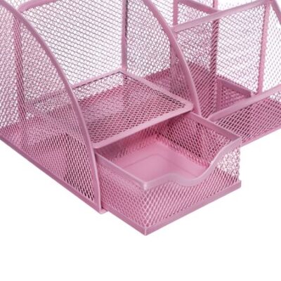 Подставка для канцелярских мелочей 7 отделений, сетка металл, розовая. <ul> Настольная подставка Calligrata с 7 отделениями обладает функциональной и стильной конструкцией, которая подходит для хранения канцелярских мелочей.</ul> <li> Прочный корпус выполнен из высококачественного металла, а сетчатое исполнение предотвращает образование пыли внутри.</li> <li> Имеются мягкие подушечки на дне, предотвращающие скольжение и повреждения поверхности.</li> <b> Идеально сочетается с другими канцелярскими товарами Calligrata.</b>