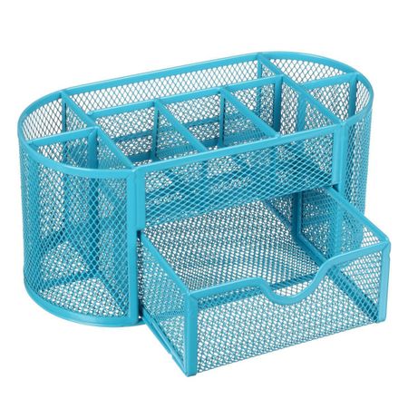 Подставка для канцелярских мелочей 9 отделений, сетка металл, голубая. <ul> Настольная подставка Calligrata с 9 отделениями обладает функциональной и стильной конструкцией, которая подходит для хранения канцелярских мелочей.</ul> <li> Прочный корпус выполнен из высококачественного металла, а сетчатое исполнение предотвращает образование пыли внутри.</li> <li> Имеются мягкие подушечки на дне, предотвращающие скольжение и повреждения поверхности.</li> <b> Идеально сочетается с другими канцелярскими товарами Calligrata.</b>