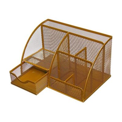Подставка для канцелярских мелочей Calligrata, 7 отделений, сетка, металлическая, золотая. Органайзер для канцелярии золотистого цвета добавит нотку изысканности и порядка в ваш рабочий уголок. Этот металлический аксессуар станет не только практичным помощником, но и стильным элементом декора для вашего стола в офисе или дома. <b> Преимущества</b> <ul> <li> Металлическая сетчатая структура обеспечивает прочность и долговечность, сохраняя при этом современный вид.</li> <li> Семь отделений предлагают удобное хранение для ручек, карандашей и других канцелярских принадлежностей.</li> <li> Золотистая отделка органично сочетается с разными интерьерами, добавляя блеска и элегантности.</li> </ul> <b> Удобство и стиль</b> Эта подставка обеспечивает легкий доступ ко всем необходимым инструментам, поддерживая рабочее место в абсолютном порядке. Заполните ее любимыми аксессуарами и наблюдайте, как преобразится ваш стол. Воплощение функциональности и эстетики — это именно то, что нужно для продуктивной работы и достойной организации.