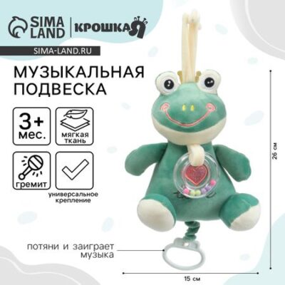 Подвеска музыкальная на кроватку/коляску Крошка Я «Лягушастик», заводная, с погремушкой, от 3 мес.. Развивающая погремушка-подвеска — это игрушка, которая подойдет для совсем маленьких детей. Подвеска с легкостью крепится на коляске, развивающем коврике или над кроваткой и привлекает внимание малыша. Это первая развивающая игрушка для грудничков: она создана из безопасных материалов. Если потянуть за висюльку и будет играть приятная мелодия Удобный универсальный крепеж в виде прищепки или разъемного кольца позволяет закрепить подвеску на коляску, кроватку или детское автокресло. Товар сертифицирован. Соответствует требованиям безопасности детской продукции. Рекомендуется детям от 0 месяцев. Развивающая игрушка-подвеска "Крошка Я" станет отличным подарком на выписку!