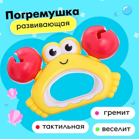Погремушка «Крабик». Погремушка «Крабик» разработана специально для малышей с рождения. Игрушка привлечет внимание дизайном, яркими цветами, и надолго займет малыша. Перед игрой и после, промывайте игрушку под проточной водой с использованием мыла, или опустите на 2-3 минуты в кипящую воду. Не забудьте тщательно просушить изделие. <b> Особенности игрушки</b> <ul> <li> При взаимодействии с игрушкой ребенок услышит забавные звуки: внутри погремушки находится элемент с гремящими при движении шариками.</li> <li> Игрушка изготовлена из безопасного материала — пластика.</li> <li> Изделие имеет оптимальный размер и форму для маленьких ручек ребенка.</li> </ul> <b> Чем полезны занятия с погремушкой</b> Взаимодействуя с игрушкой, ребенок тренирует мелкую моторику, координацию движений, развивает воображение, слуховое и визуальное восприятие.