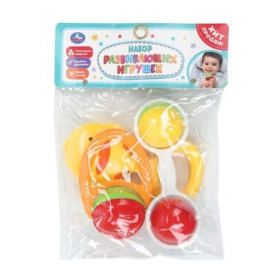 Погремушка 2007M163-R. Набор развивающих игрушек ТМ «УМка» разработаны специально для малышей:<br> — яркие цвета<br> — интересные формы<br> — гремящие шарики<br> — удобно держать<br> — 3 игрушки в комплекте<br> <br> Игрушки выполнены из окрашенного в красочные цвета, прочного и безопасного материала. Симпатичный дизайн, «хватательные» рельефные элементы и гремящие шарики привлекут внимание ребенка, который с удовольствием будет играть с такими милыми игрушками.<br> <br> Игра с погремушками ТМ «УМка» развивает:<br> — зрительное восприятие<br> — тактильные ощущения<br> — мелкую моторику рук<br> — координацию движений<br> — внимание<br> — цветовосприятие<br> <br> Размер: овал — 11 х 7 х 5 см, погремушка-гантелька — 12 х 5 х 4 см, игрушка в виде утенок — 13,5 х 6,5 х 2 см. Материал: пластмасса.<br> Рекомендовано детям младшего ясельного возраста.