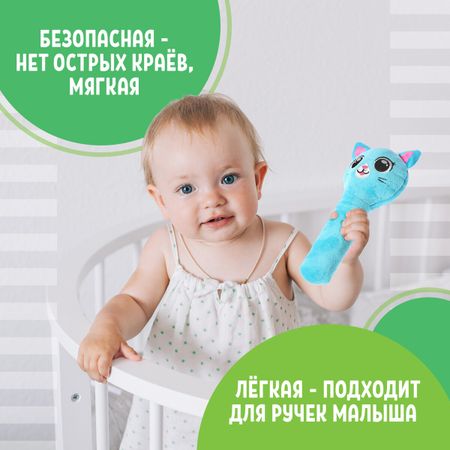 Погремушка музыкальная детская «Котик», русская озвучка. Музыкальная погремушка в виде милого котика привлечет внимание трогательным дизайном и надолго займет малыша. Игрушка не только развлечет ребенка — с ней кроха потренирует слуховое восприятие, тактильные ощущения и зрительно-моторную координацию. <b> Особенности игрушки</b> <ul> <li> Воспроизводит одну веселую песенку на русском языке.</li> <li> При взаимодействии с игрушкой малыш услышит звуки погремушки.</li> <li> Верх сшит из мягкого полиэстера, наполнитель — синтепон.</li> <li> Для работы необходимы 2 батарейки типоразмер LR44. Батарейки в комплекте.</li> </ul> <b> Рекомендации по уходу за игрушкой</b> <ul> <li> Если изделие испачкается, его можно протереть влажной губкой или постирать в теплой воде, предварительно вытащив музыкальный чип.</li> <li> Рекомендуем стирать в воде при температуре 30–40 °C в режимам «Деликатная стирка», «Ручная стирка», «Шерсть».</li> <li> После водных процедур игрушку необходимо хорошо просушить, чтобы избежать появления неприятного запаха затхлости.</li> </ul> Подходит для детей от 3 месяцев.